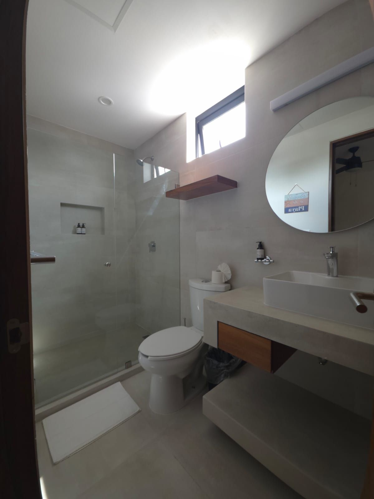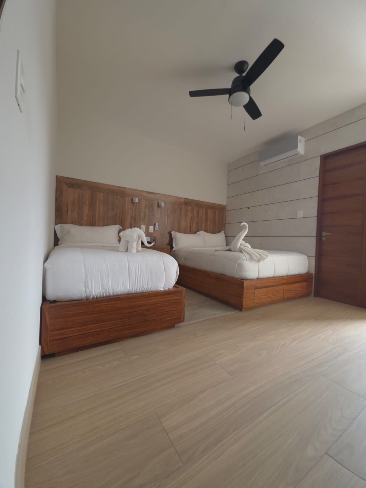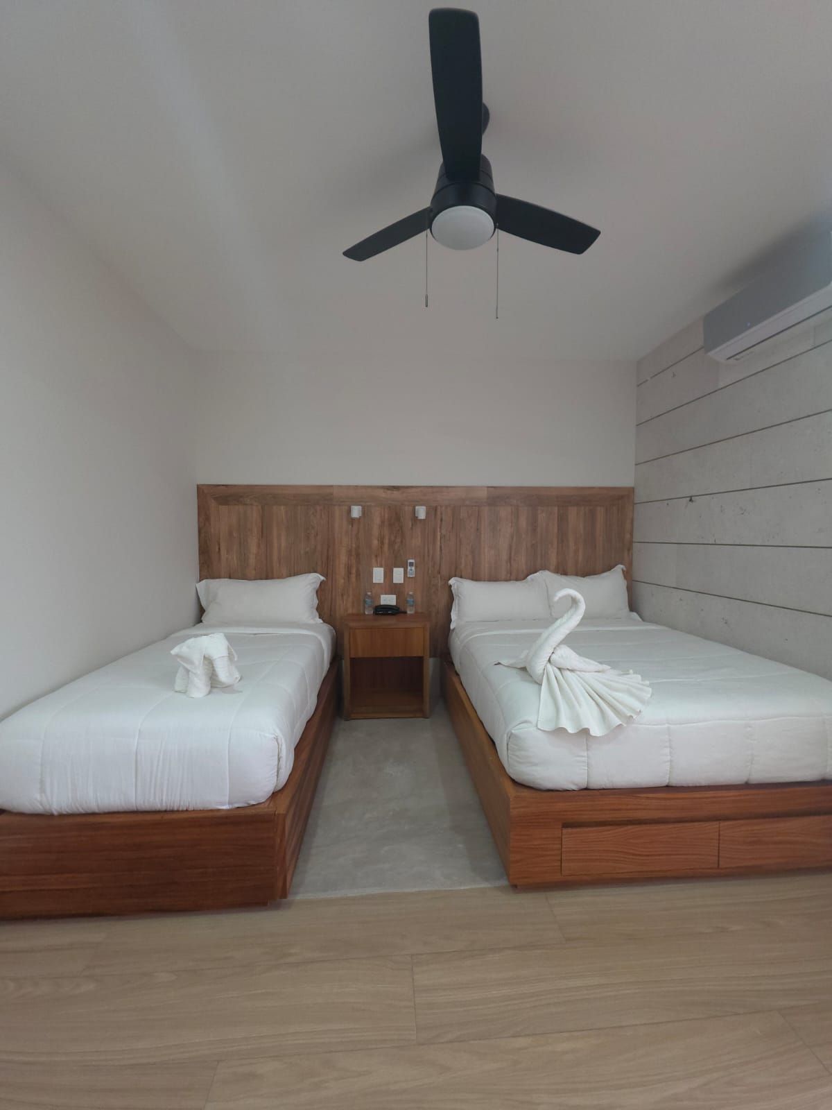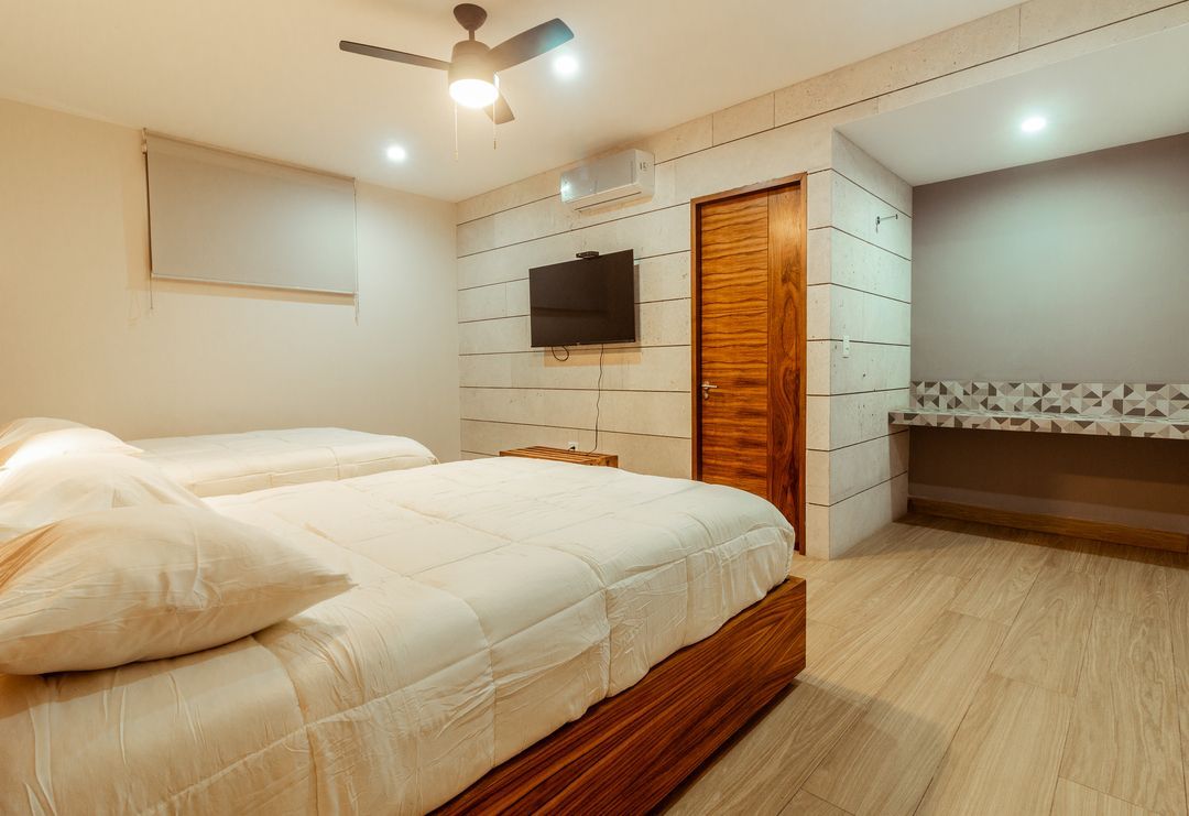 Acogedora habitación equipada con una cama matrimonial y una cama individual, perfecta para familias pequeñas o grupos de amigos. Incluye aire acondicionado, baño privado y un estilo fresco y moderno. Perfecta para aquellos que buscan espacio sin sacrificar estilo ni funcionalidad.